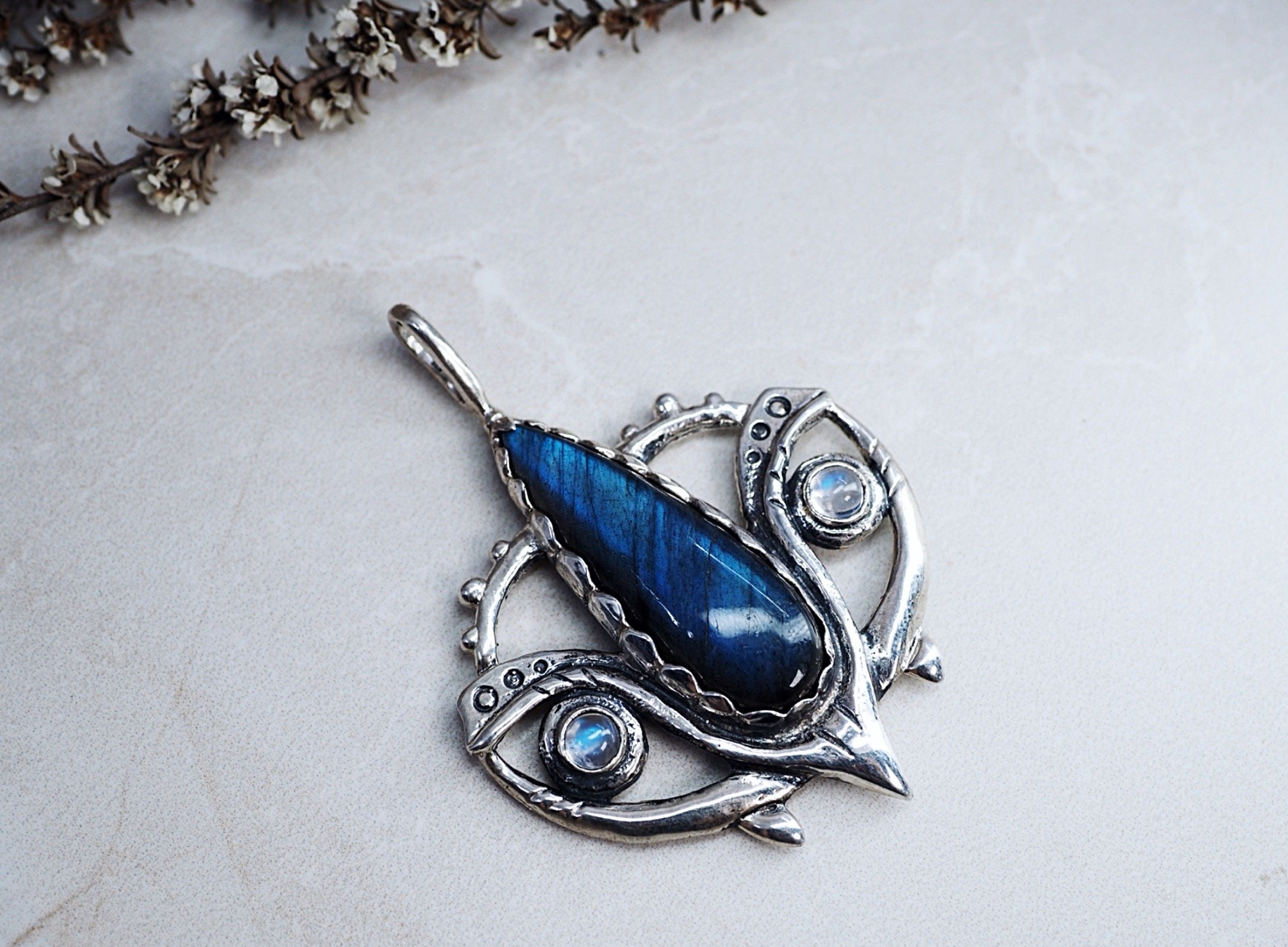 Mesmerising and bold pendant, created by yours truly. With stunning labradorite sitting in the centre and two points of moonstone either side. This beauty really encapsulates magic and wisdom.