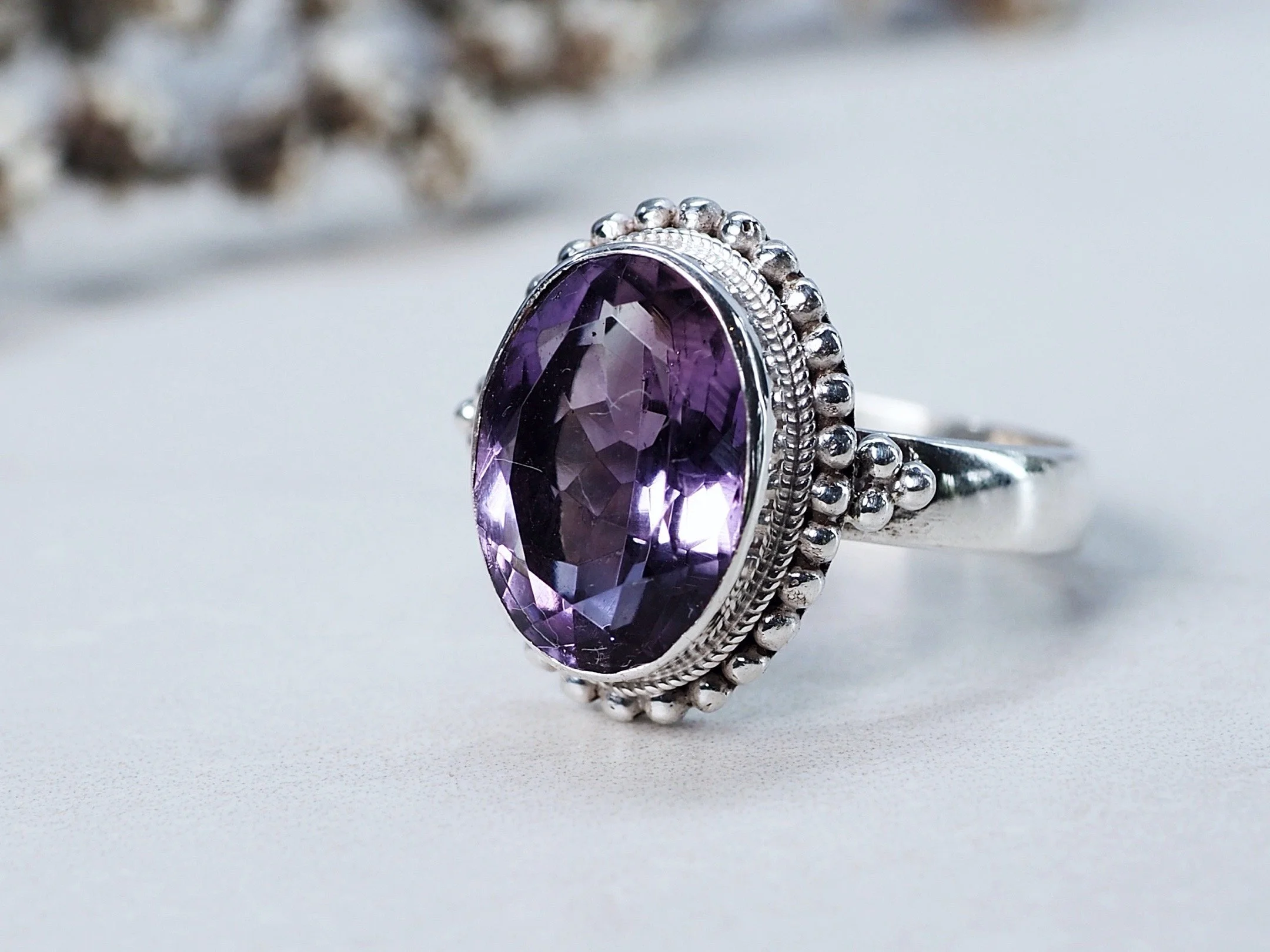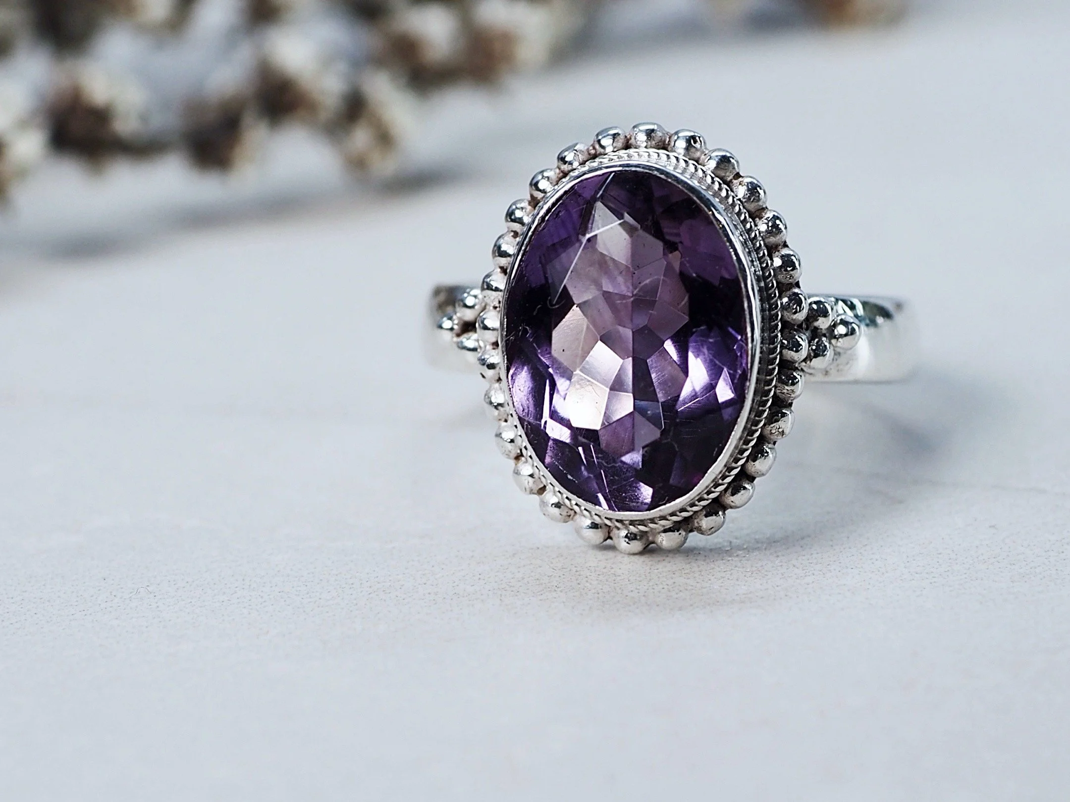 A stunning faceted Amethyst crystal sits in solid sterling silver, with detailed balls surrounding the gem, this ring is truly eye catching and will bring an element of sparkle into your day.