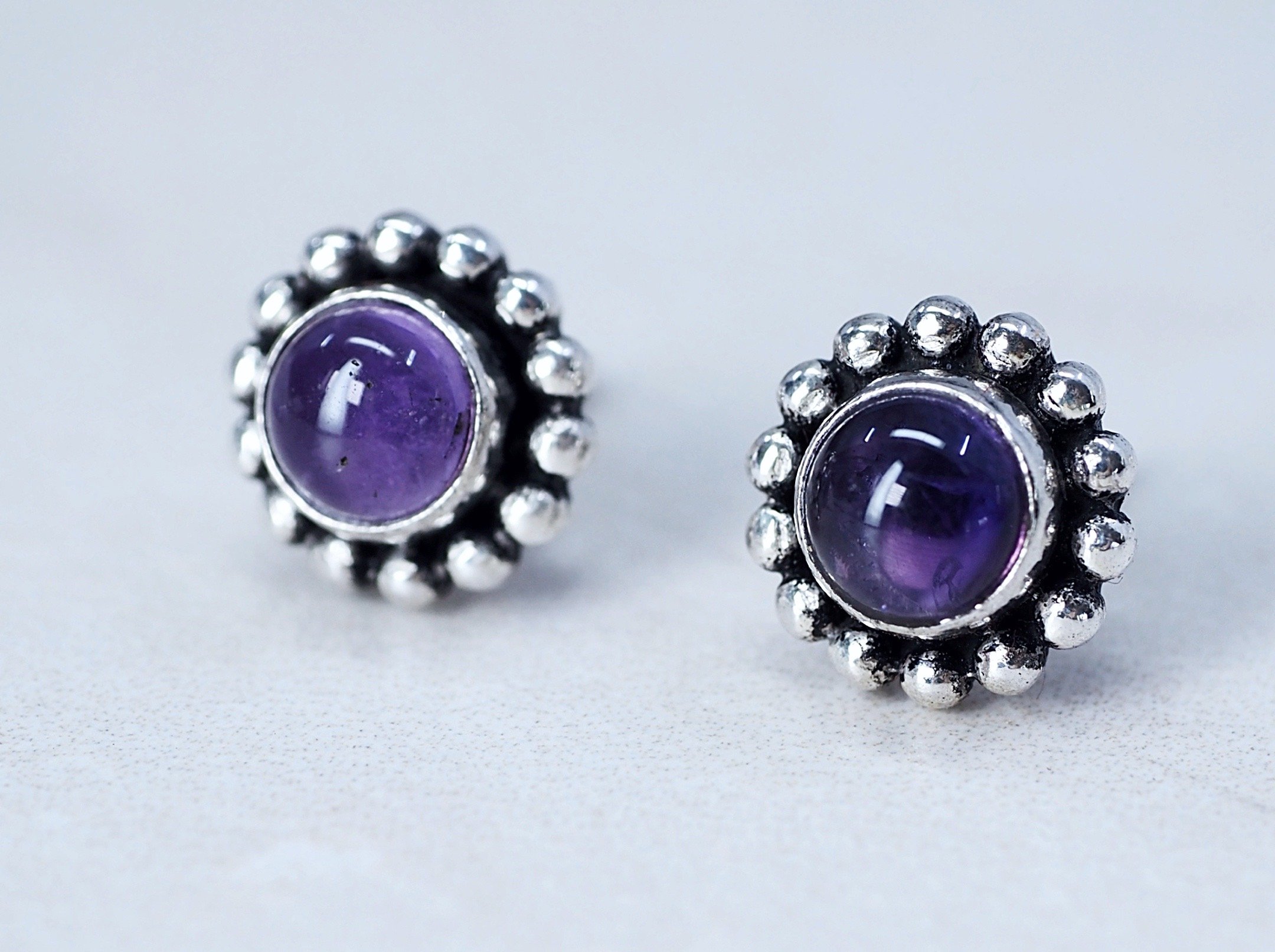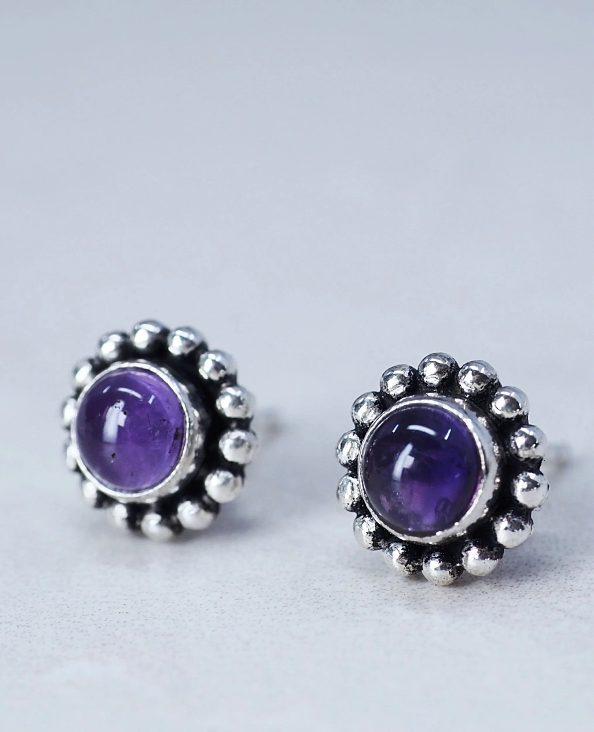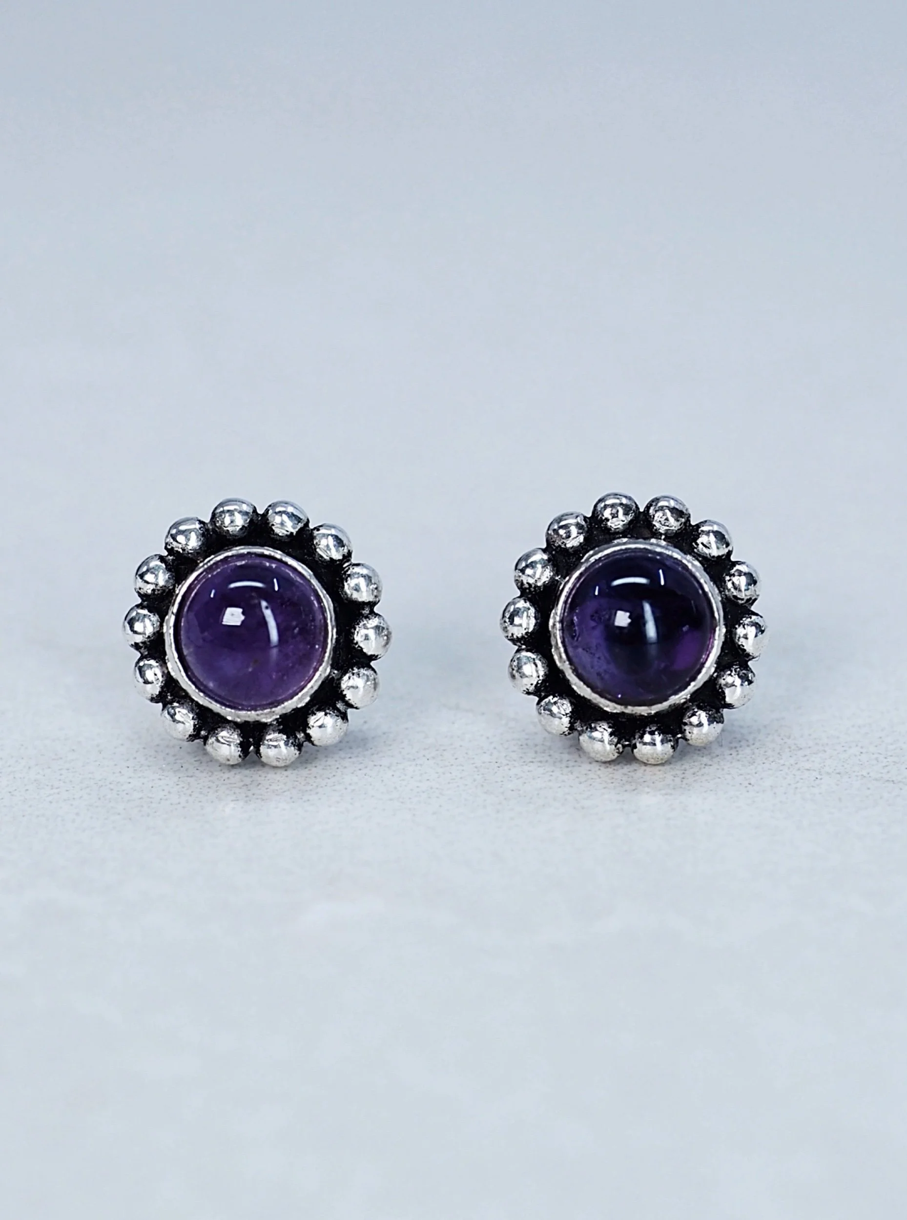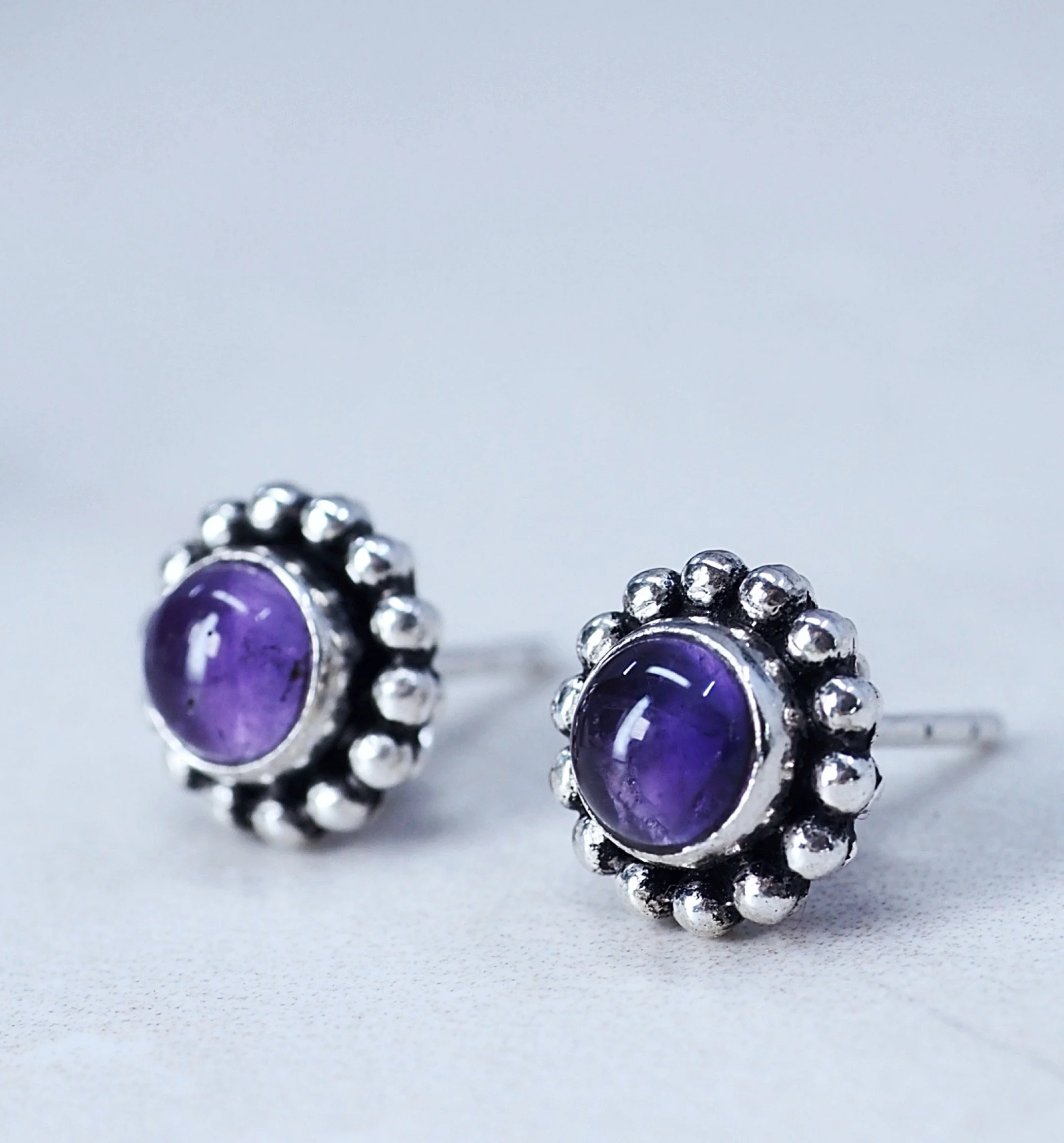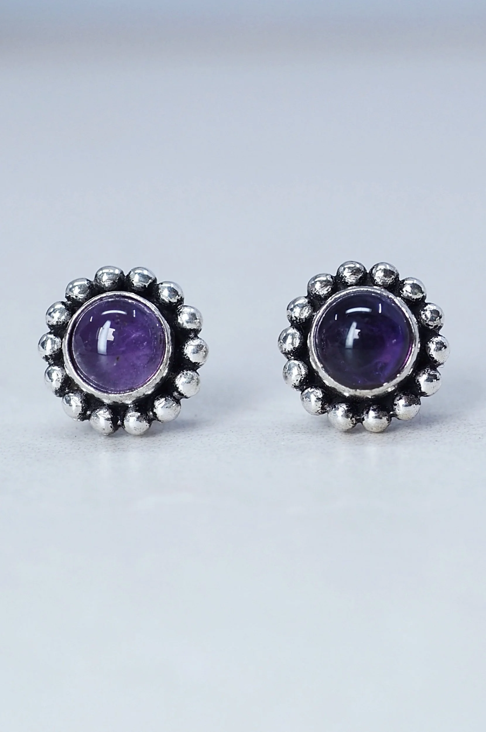 Stunning Amethyst set into sterling silver with detailed balls surrounding the crystal. A look that could represent the sun or a flower. A perfect set of studs for any day.