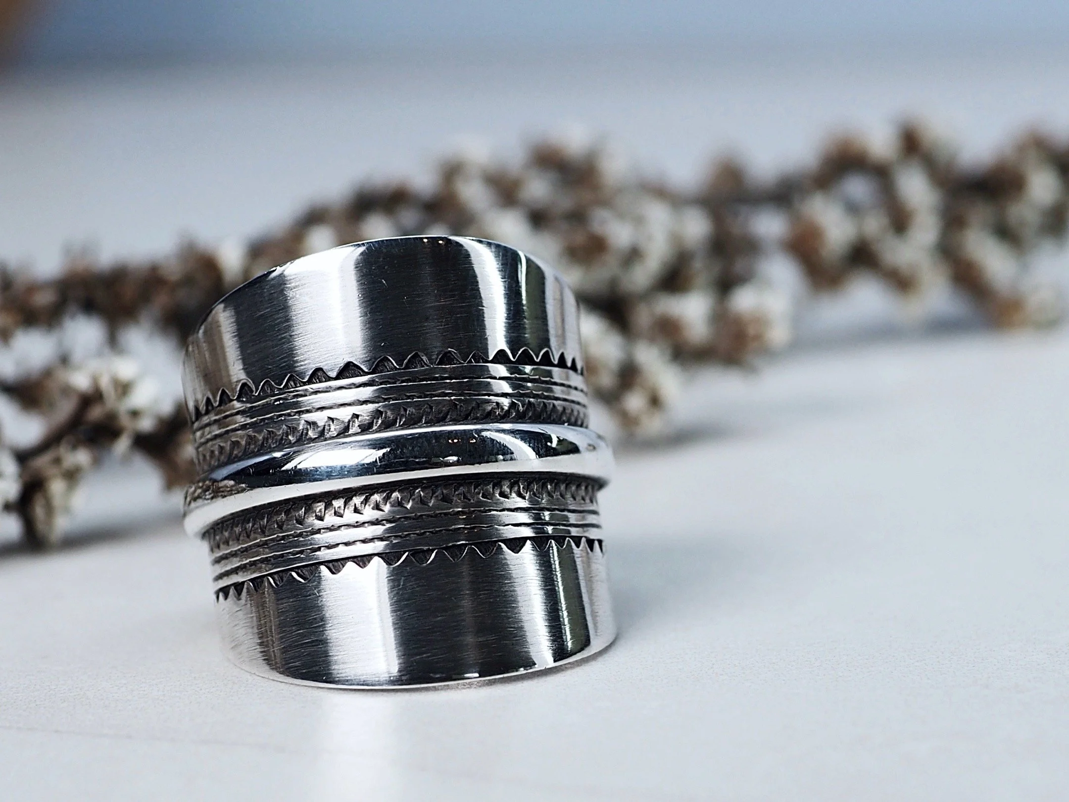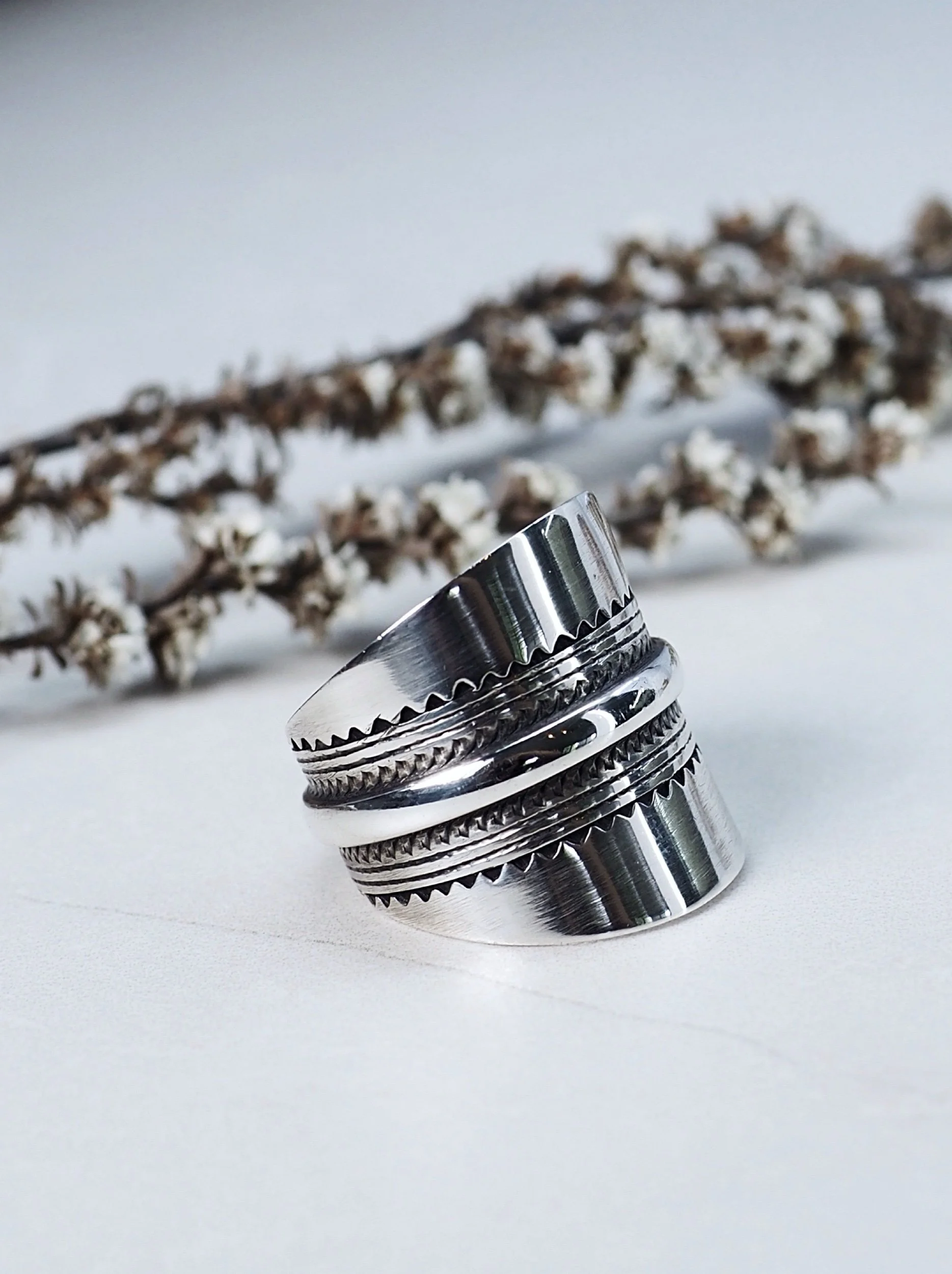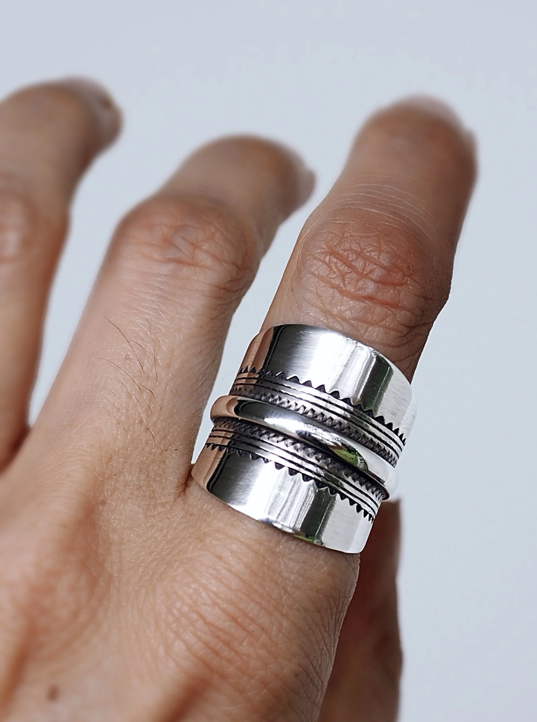 Beautiful thick silver ring with detailed hand carved pattern and features an added middle band.