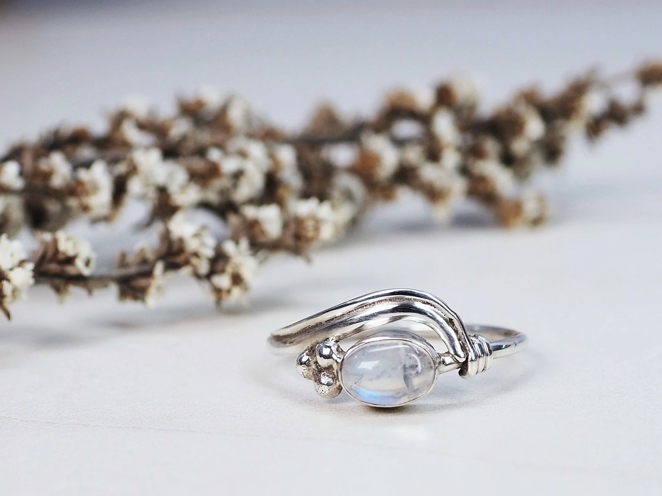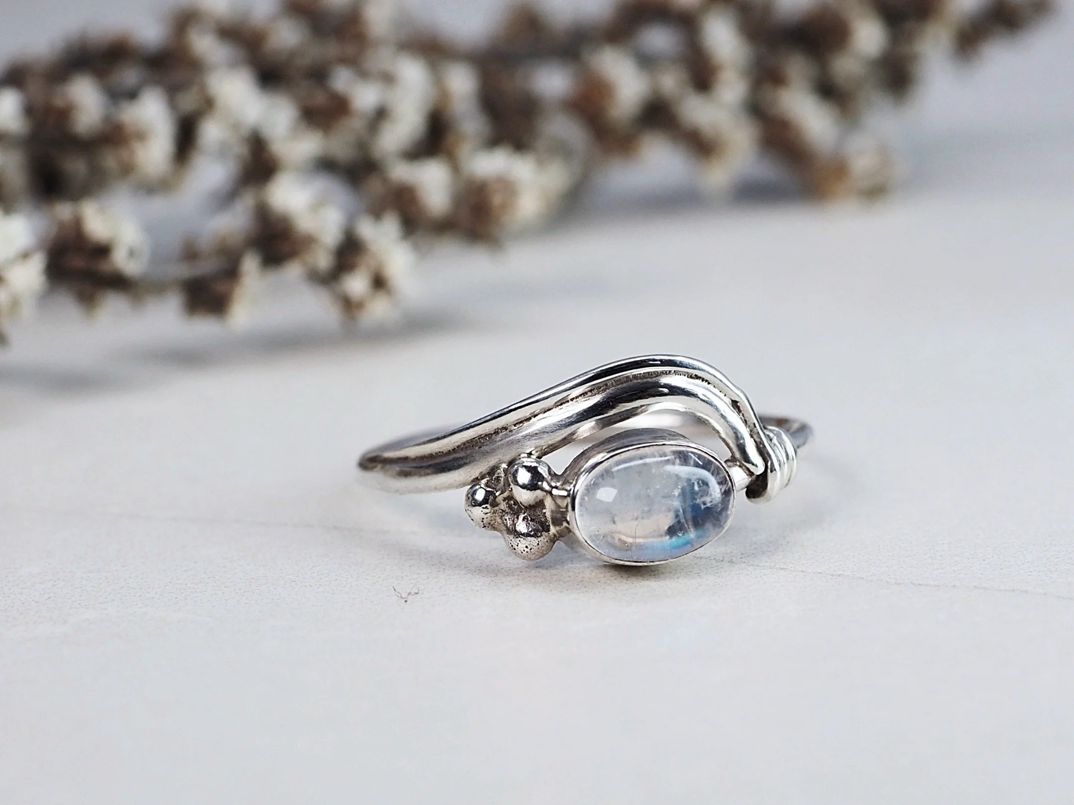 A beautiful ring with a silver wave flowing across the top of a magical moonstone crystal and three added silver accents to the side.
