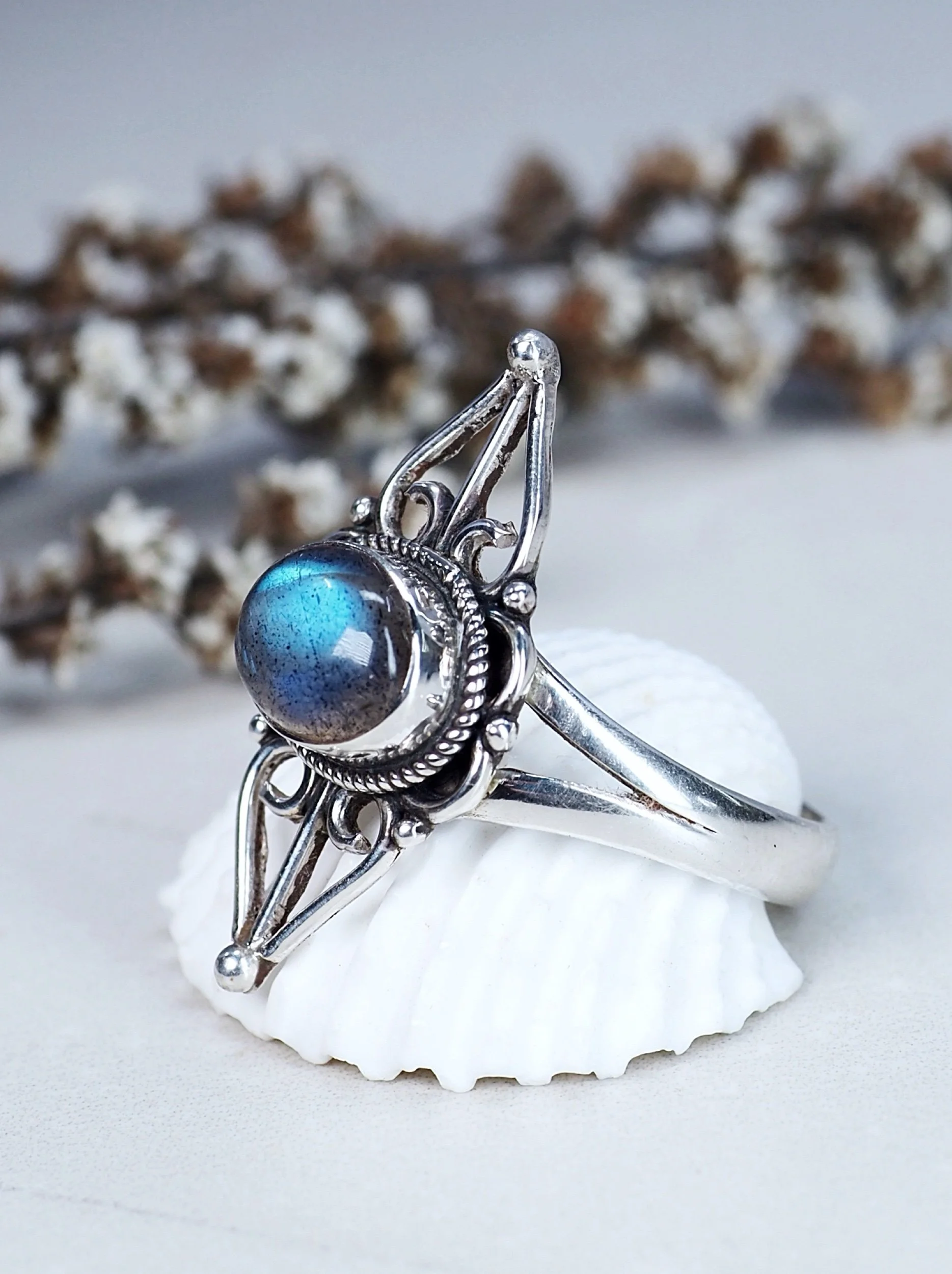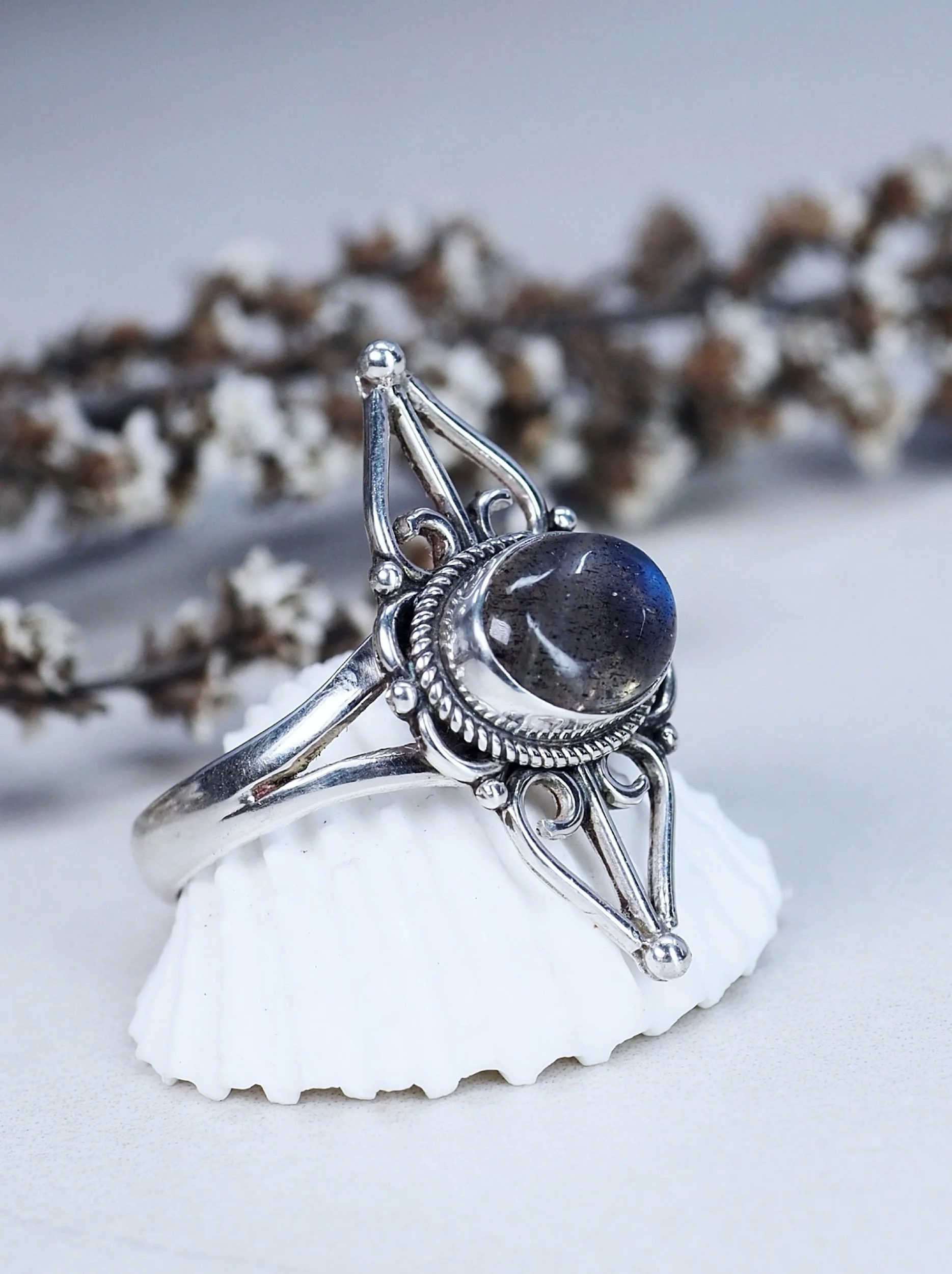 This lovely ring is a unique design and includes a magical Labradorite crystal set into high quality silver.