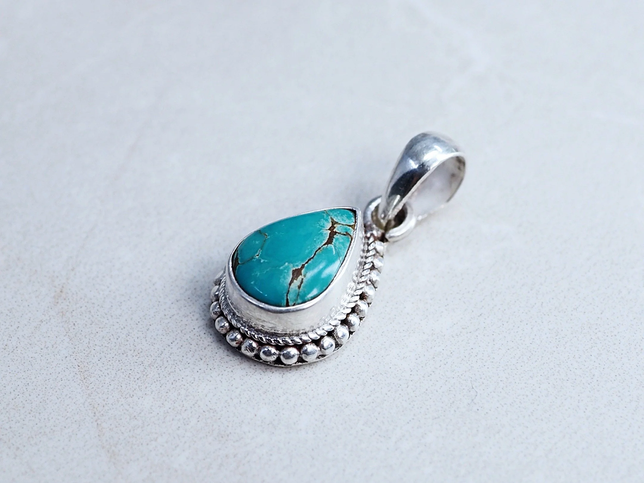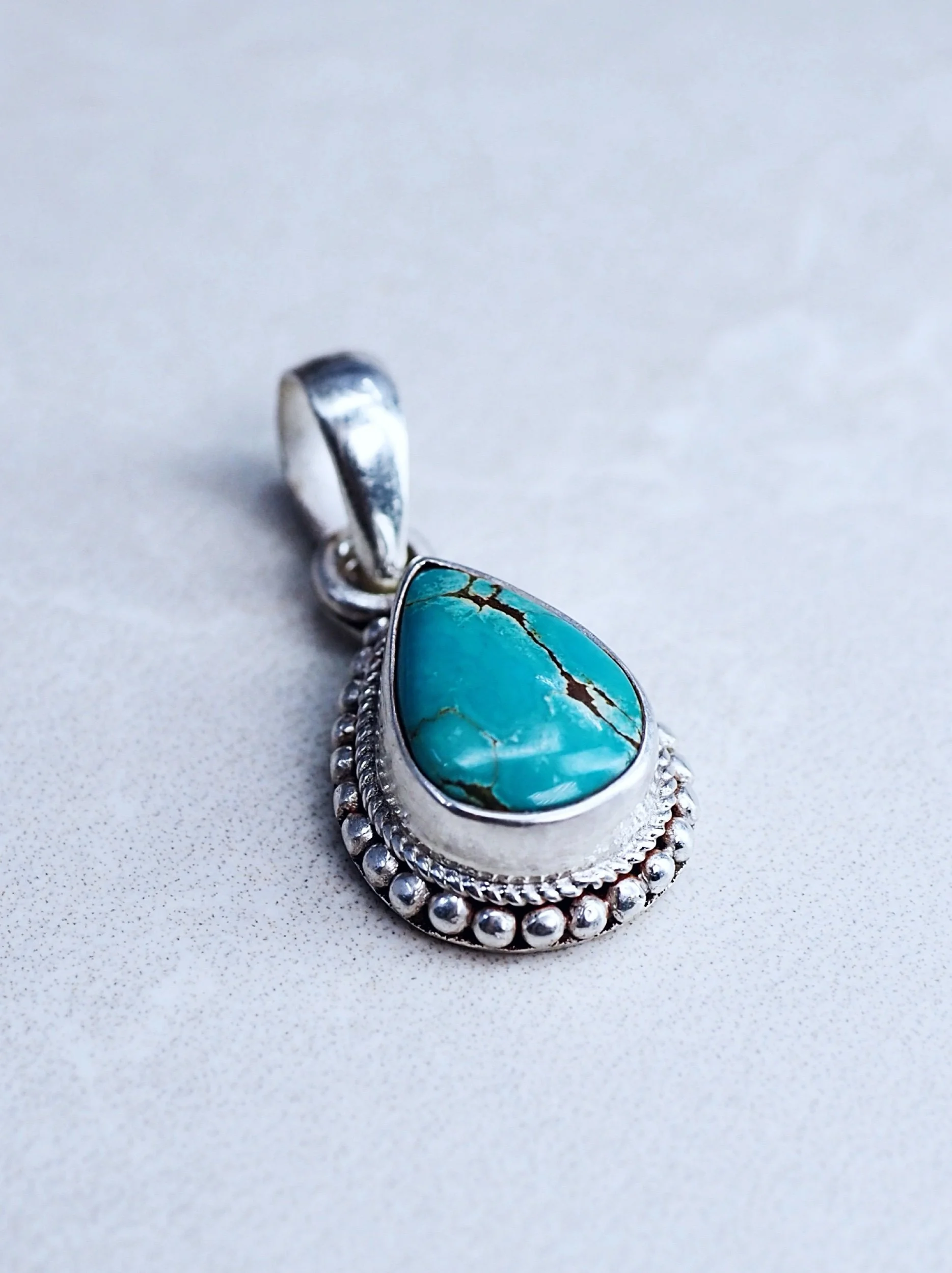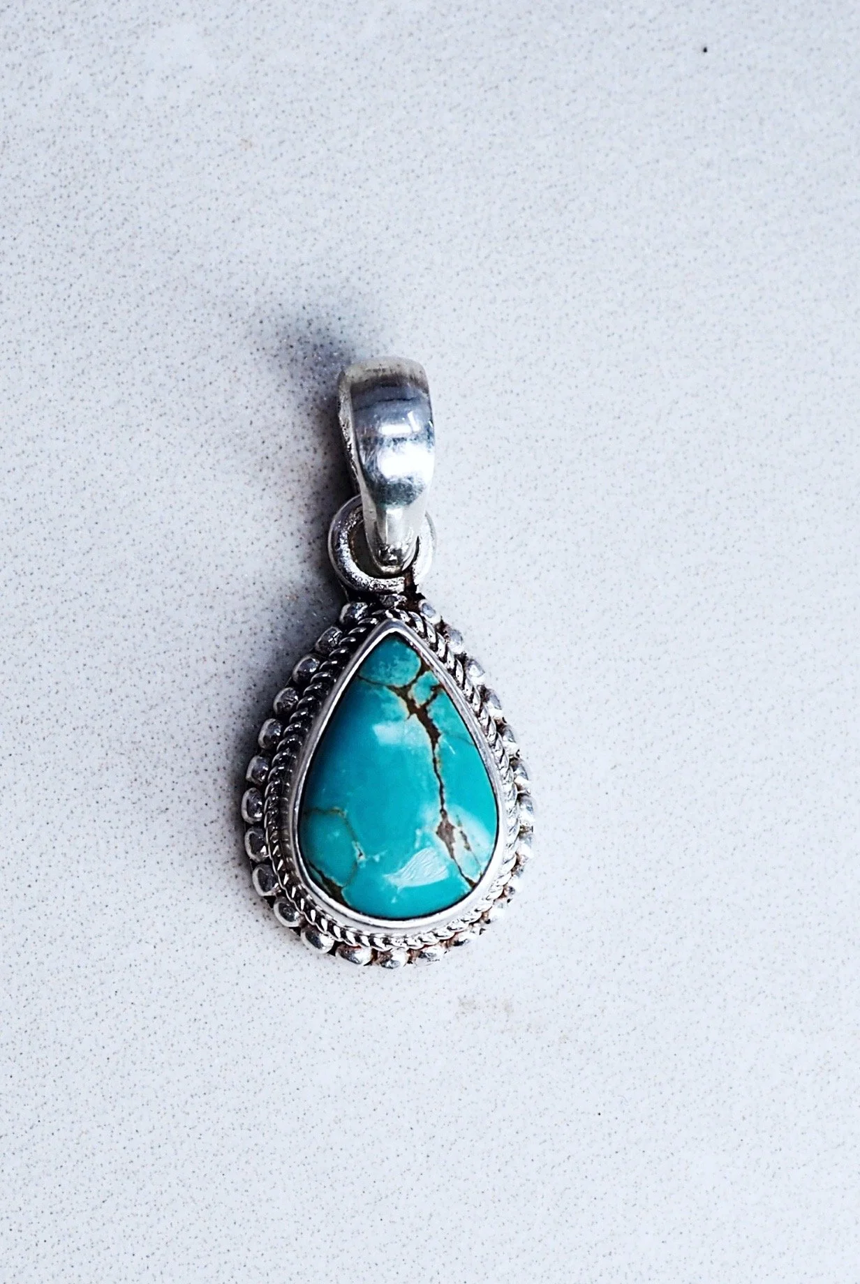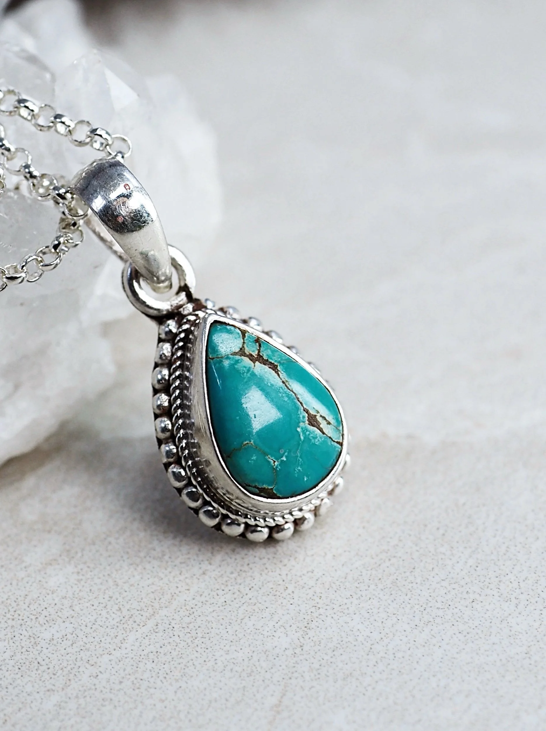 A teardrop shaped pendant featuring a smooth Turquoise gem and silver dots around the outside. Truly a beautiful, feminine piece to wear.