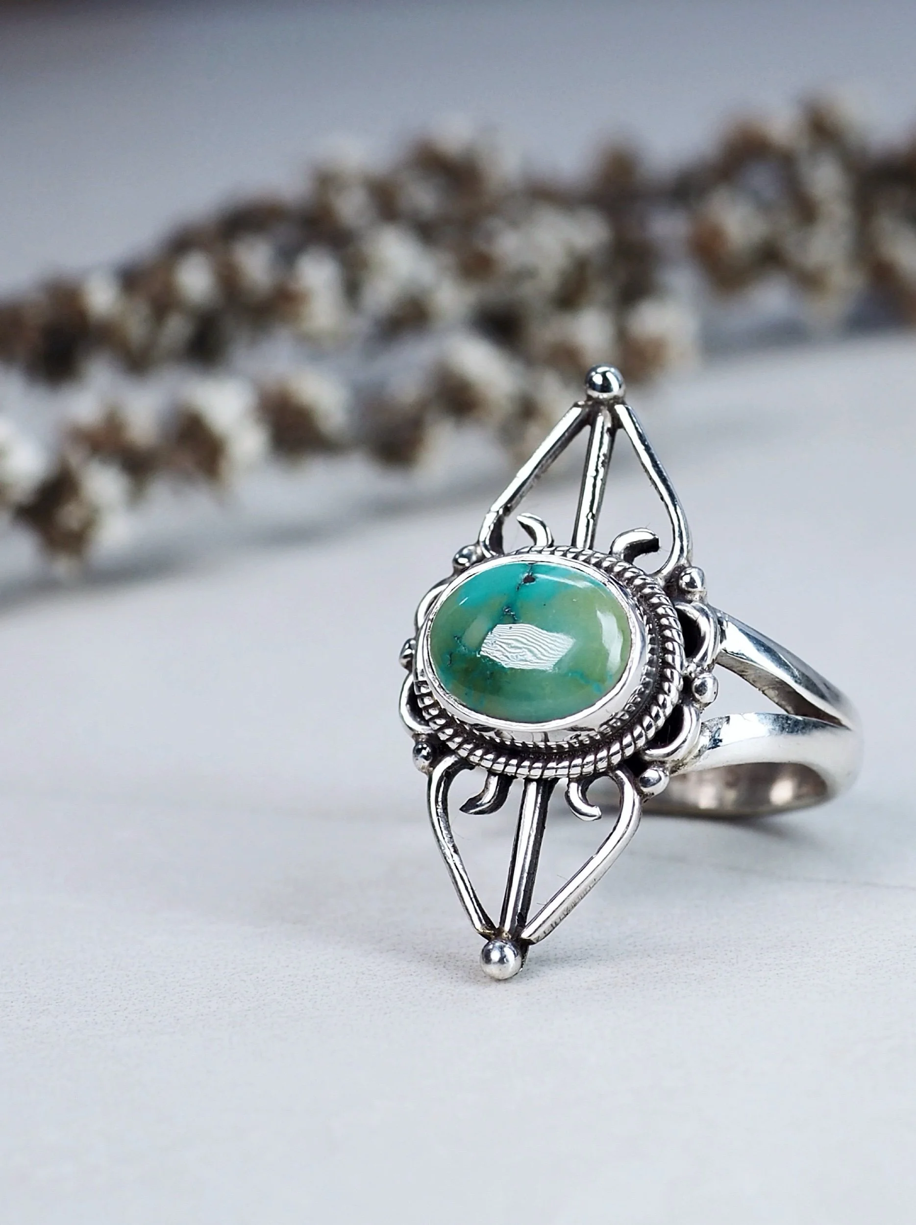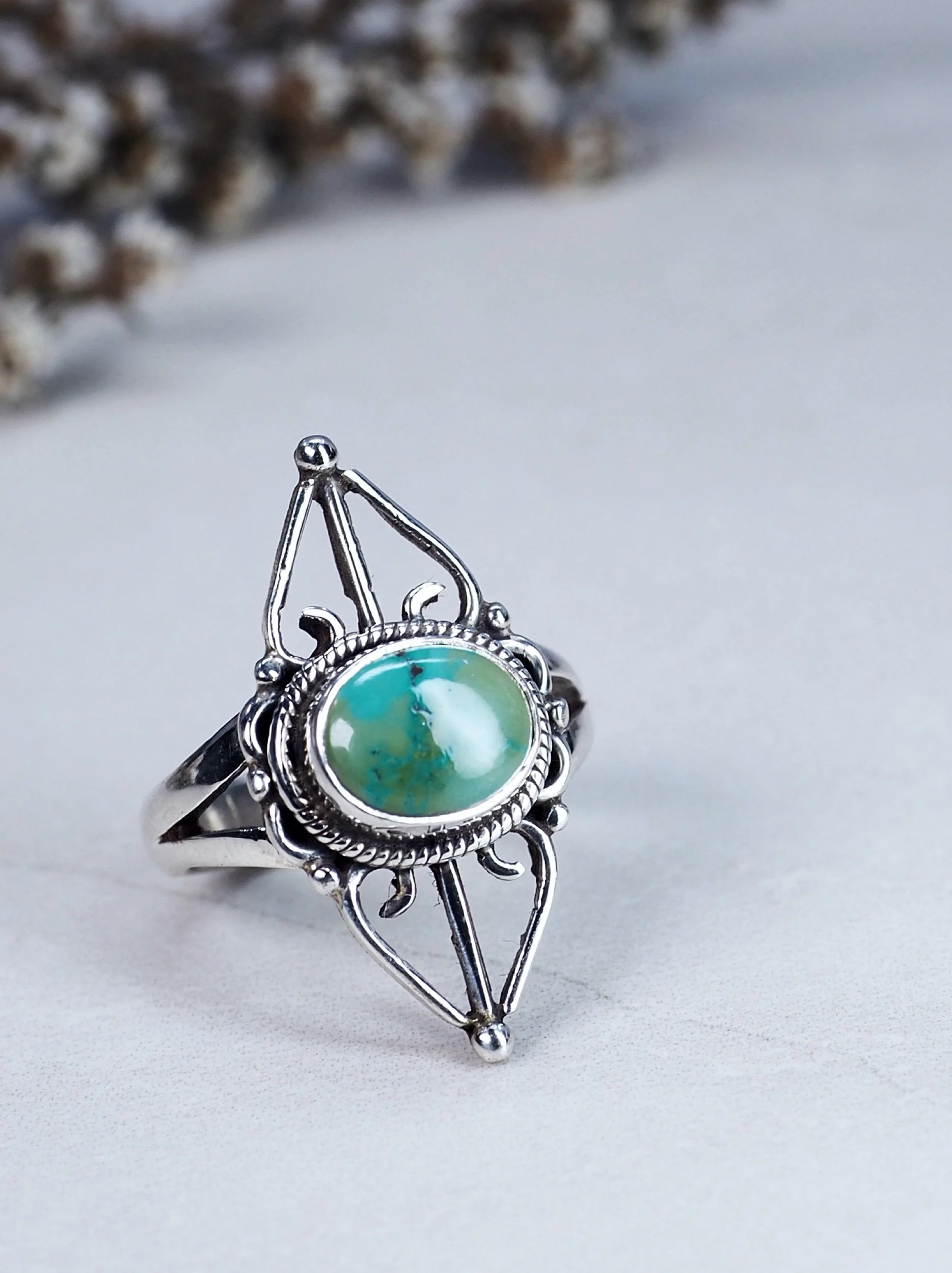 This lovely ring is a unique design and includes a beautiful Turquoise piece set into high quality silver.