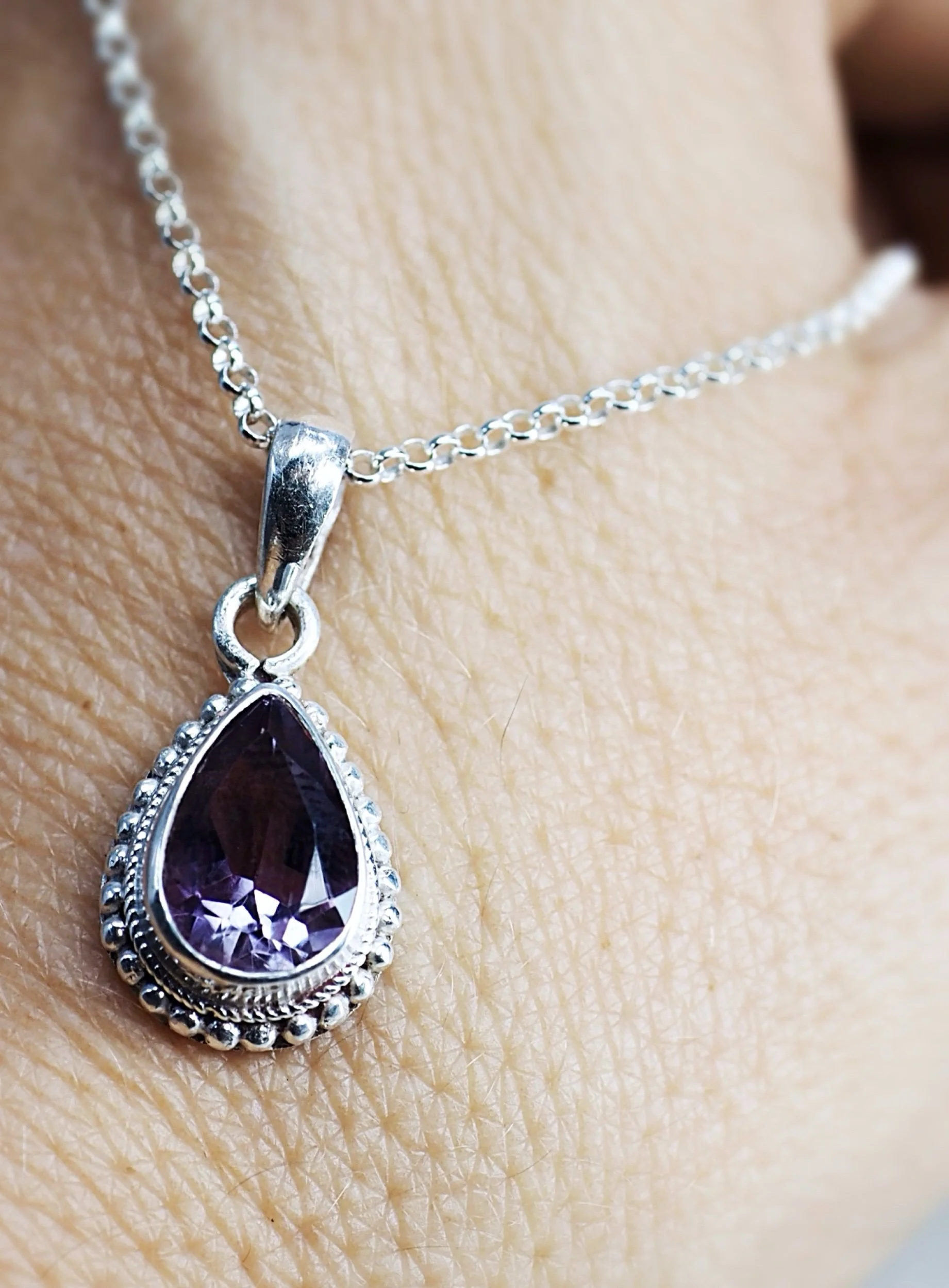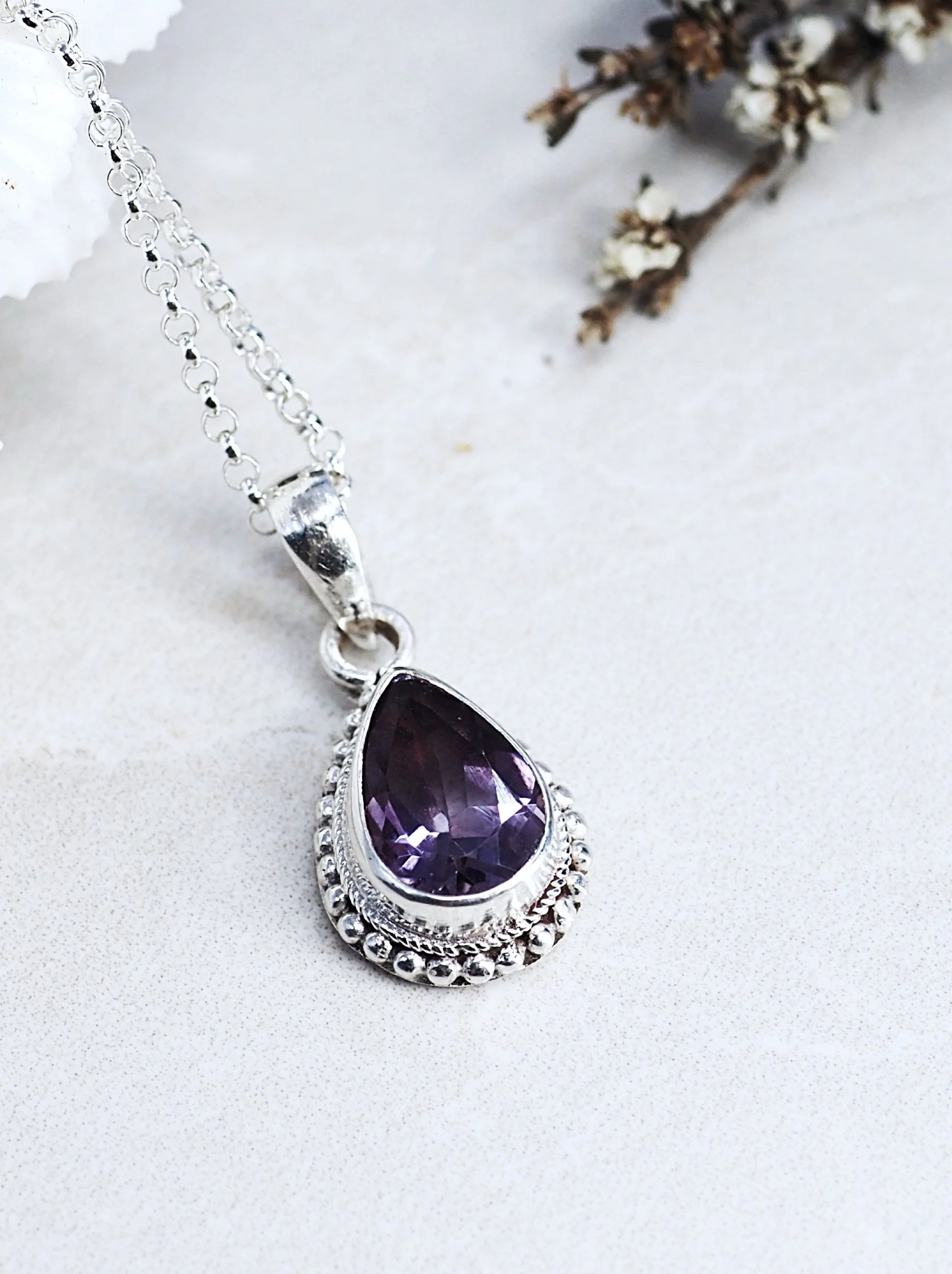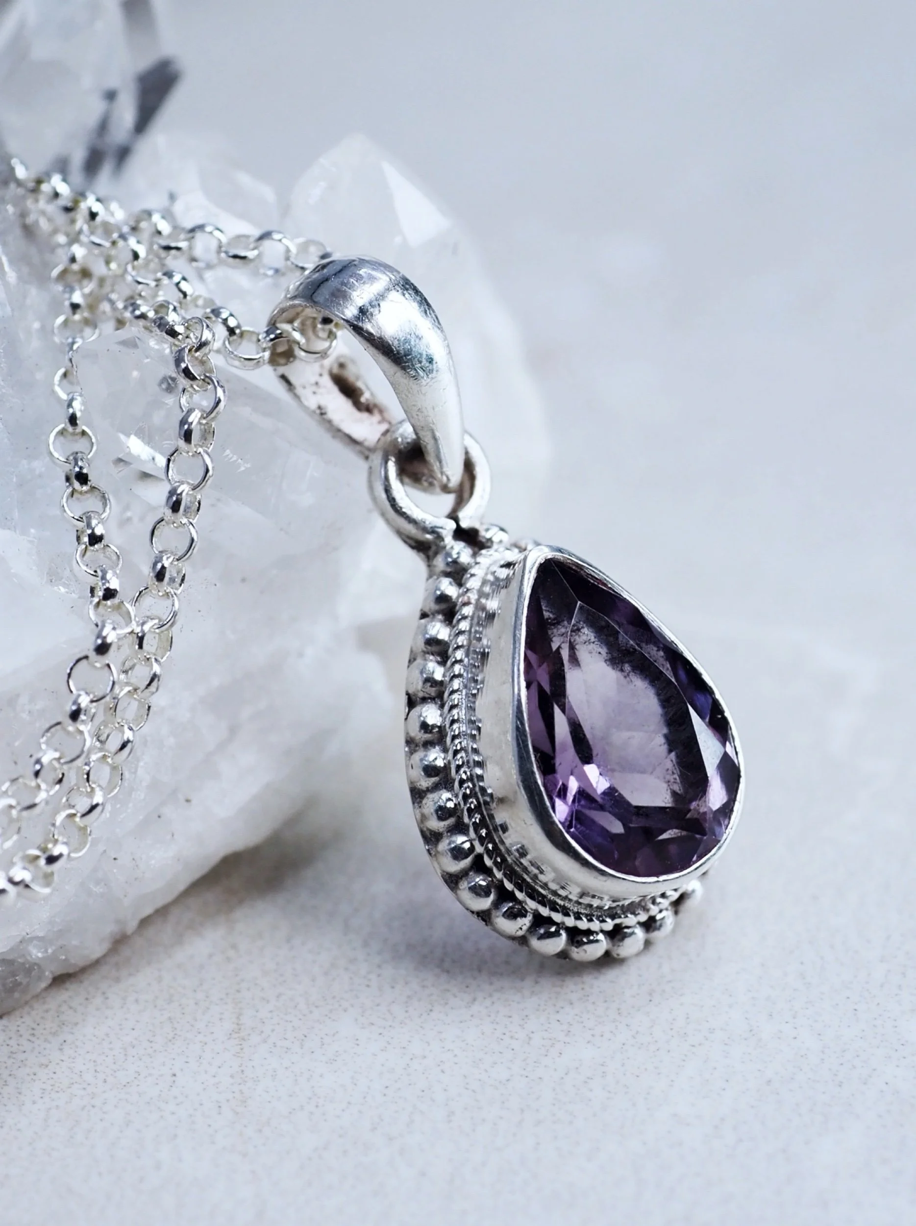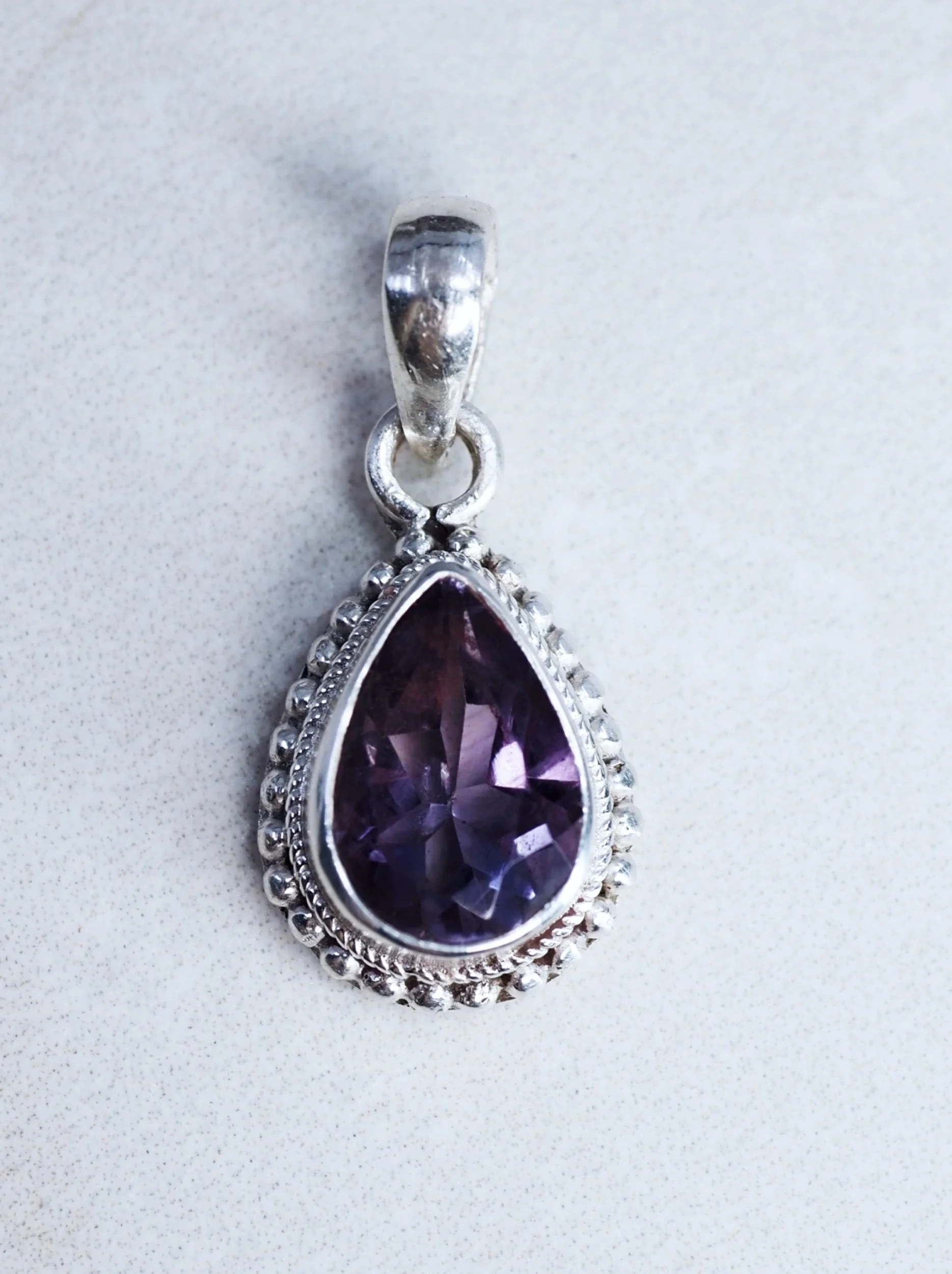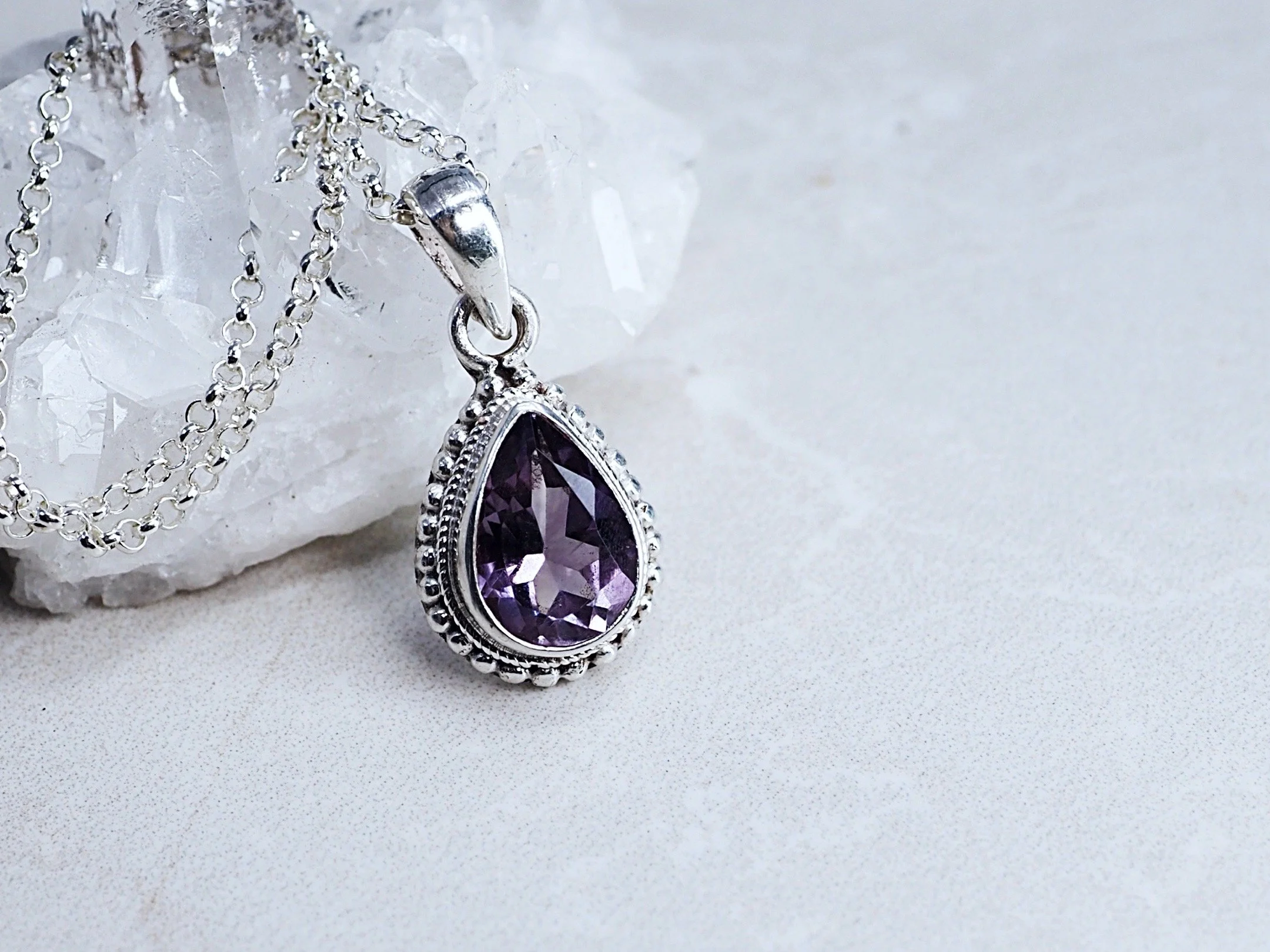 A teardrop shaped pendant featuring a faceted Amethyst gem and silver dots around the outside. Truly a beautiful, feminine piece to wear.